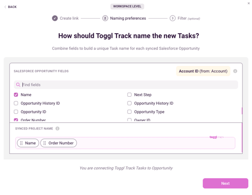 In this next step, you'll use fields from the Salesforce object to tell Toggl Track how to name each new imported opportunity. Fields are different kinds of data for each object that help define it – in this case, an Account has an ID, a name, a stage, and amount, and so on.