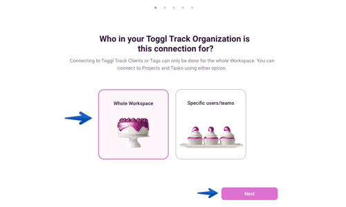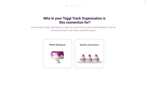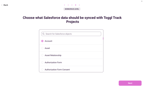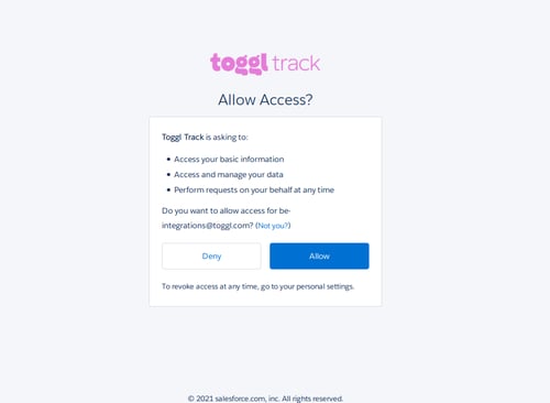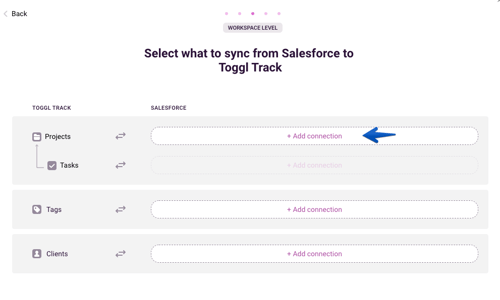 This means that everyone in your Toggl Track Workspace will have access to the Projects, Tasks, Clients, and/or Tags that this connection syncs from Salesforce. In Toggl Track, all Clients and Tags need to be visible to everyone in your Workspace, so you can only sync to these two using this whole Workspace connection.