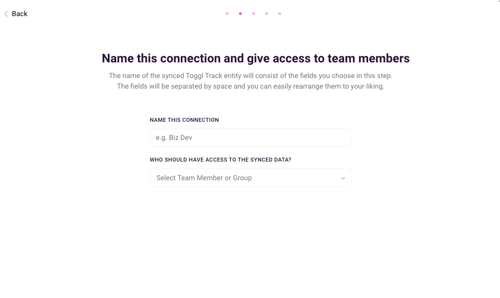Using this option, you can specify specific users or teams within your Toggl Track Workspace that will have access to the Projects and Tasks that this connection syncs from Salesforce. Any Toggl Track Workspace team member who is not selected as part of this step will not be able to see the Projects/Tasks created by this connection. Currently in Toggl Track, it's not possible to limit Clients or Tags to specific users, so syncing to these is not available with this option.