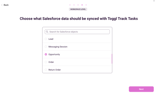 Here is where you pick the objects from Salesforce that should be synced to Toggl Track. You can sync Salesforce objects as Projects, Tasks, Tags, and/or Clients – and note that each one is optional! For example, you could just sync Salesforce Accounts to Toggl Track Clients and continue with the setup from there. Or as another example you could sync Accounts to Projects, Opportunities to Tasks, Contacts to Clients, and Products to Tags.