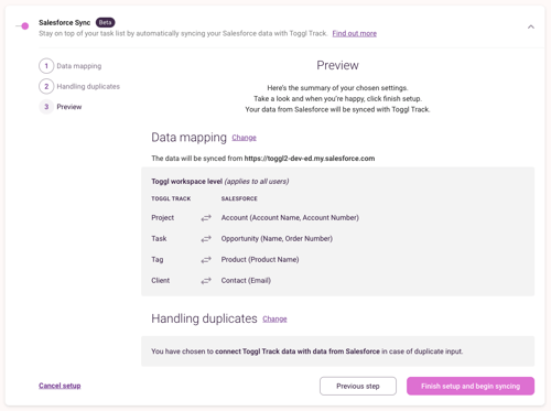 When you're satisfied that everything looks good, finish the setup and enjoy your new Salesforce Sync integration! Your data will begin syncing right away.