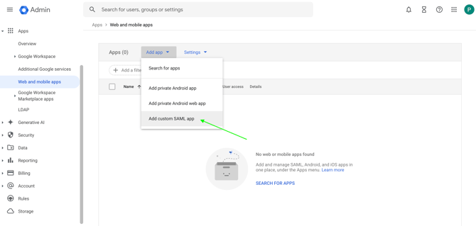 Click on the Add app dropdown and select Add custom SAML app: