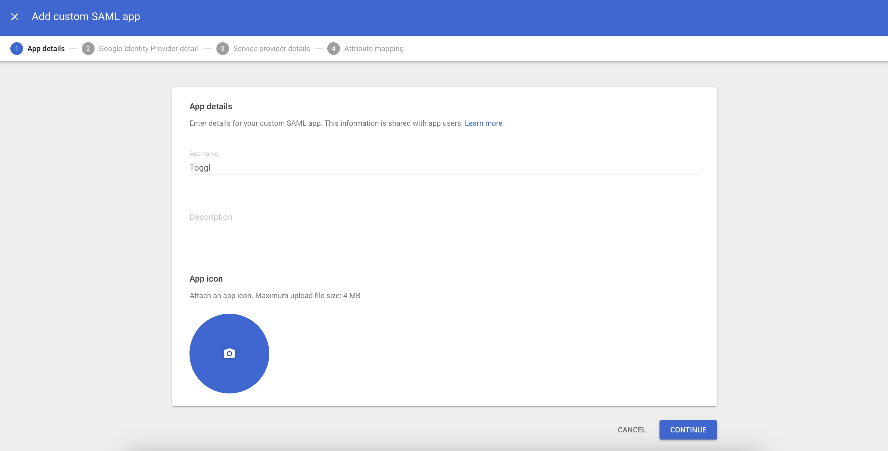 Give the app a name, a description and a logo. Your users will see those details on the list of apps available in the Google Workspace. Click Continue: