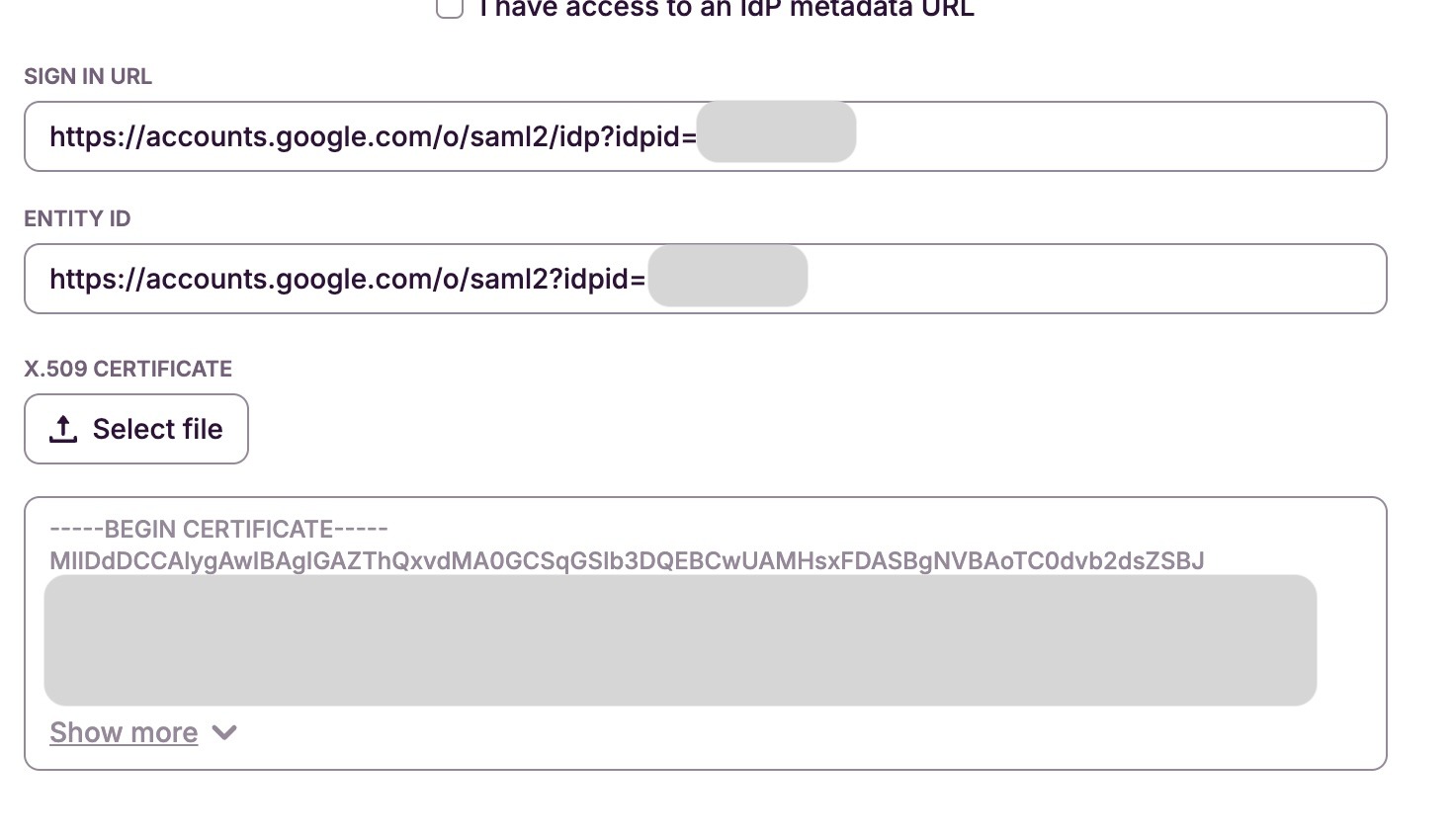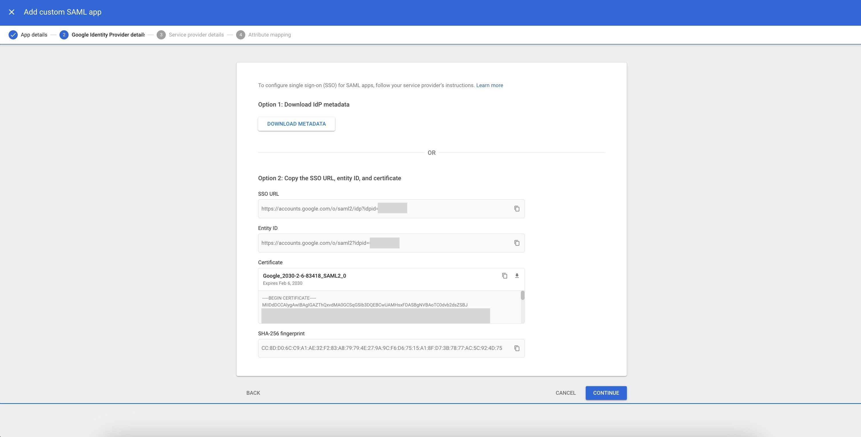 You will be presented with SSO URL, Entity ID and a Certificate. We will need these values shortly.