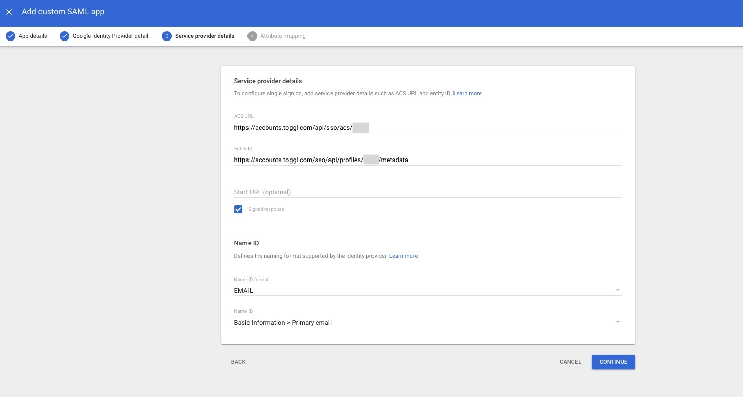 Now go back to Google Workspace and fill in the values obtained from Toggl. Make sure to tick Signed response, select EMAIL as Name ID Format and use Basic Information → Primary email as the Name ID. Click Continue.