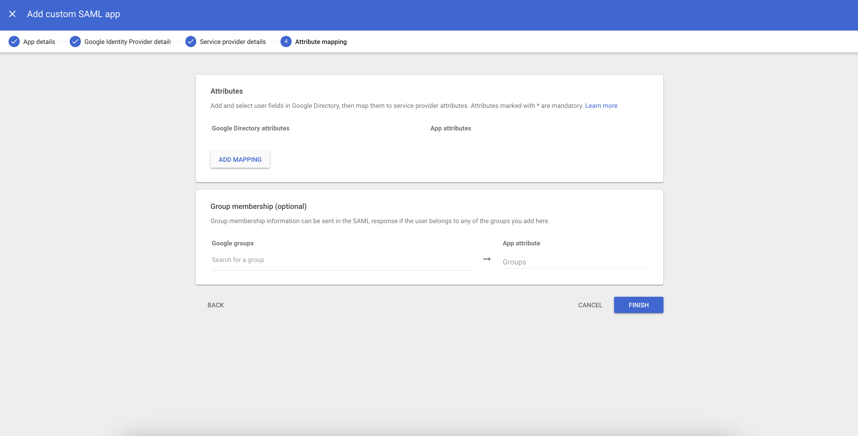 On the next screen simply click Finish as we do not require any additional attribute mapping: