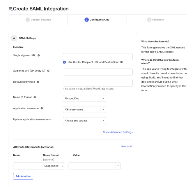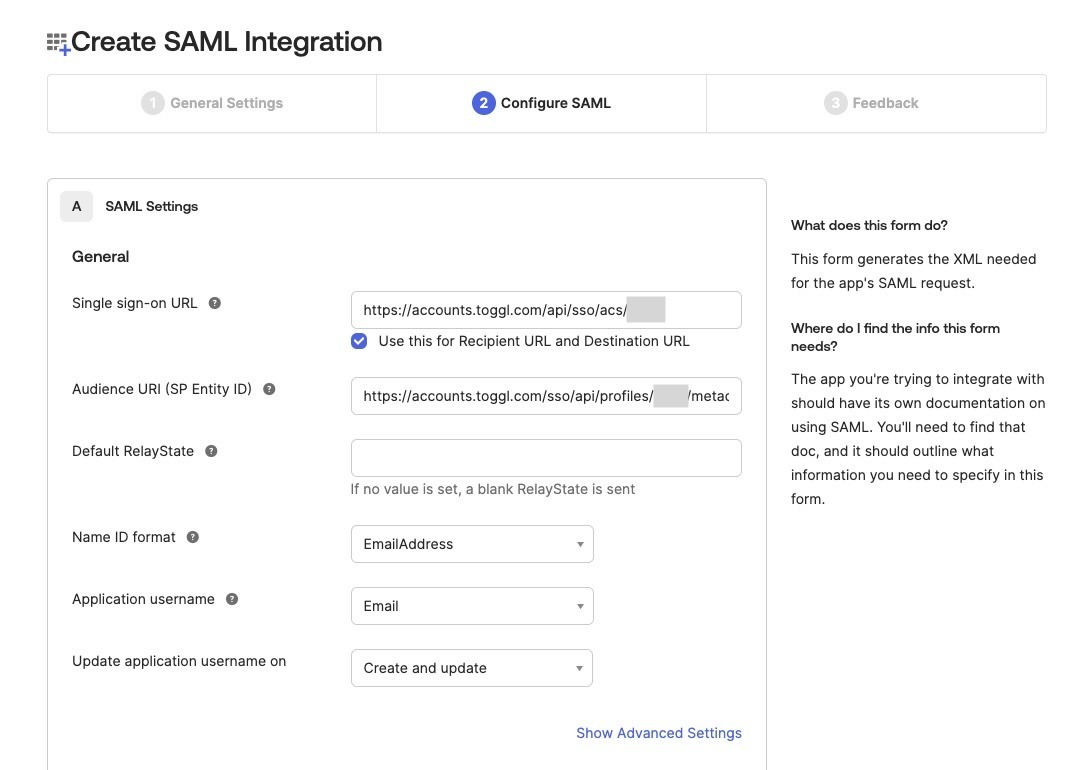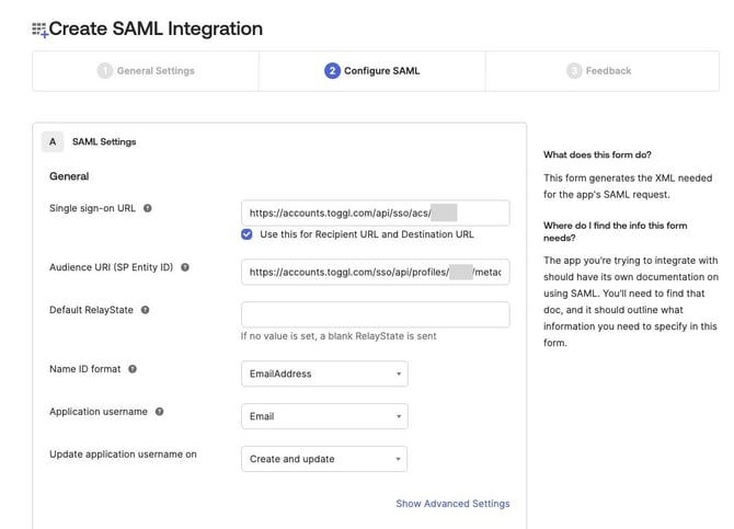 Go back to Okta Settings and use the values obtained from Toggl to fill in the Single sign-on URL field using the ACS URL from Toggl and then filling the Audience URI using the Entity ID from Toggl**.** In addition, set the following parameters: Name ID format to EmailAddress Application username to Email