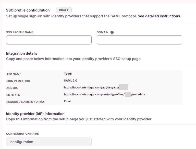 These options come from Toggl, so let’s jump there for a moment in another browser window. Go to Toggl Profile Settings and choose Create SSO Profile