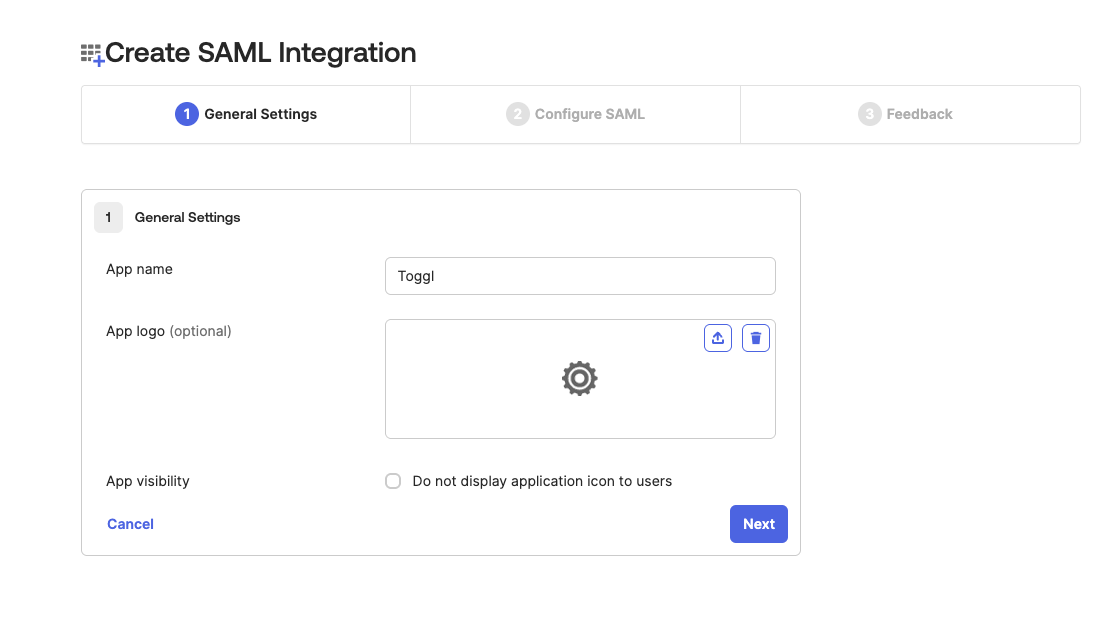 Set the app name and logo. You may wish to tick the Do not display application to users if you would like to enable the app later.