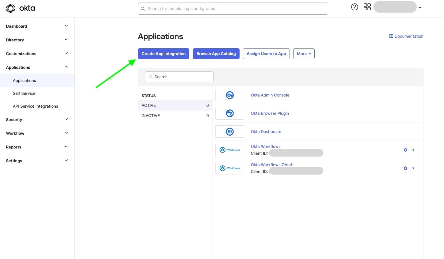 Log in to the Okta Admin panel and choose Create App Integration in the Applications tab