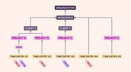 Here’s a visual breakdown of the different data elements in Toggl Track and their relationship to one another: