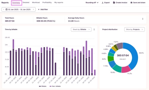 Use the Summary Report to see the total tracked time broken down in different ways. A common question answered by this report is "How much time did we track for a specific activity?". You can also generate an invoice to send to a client from this page.