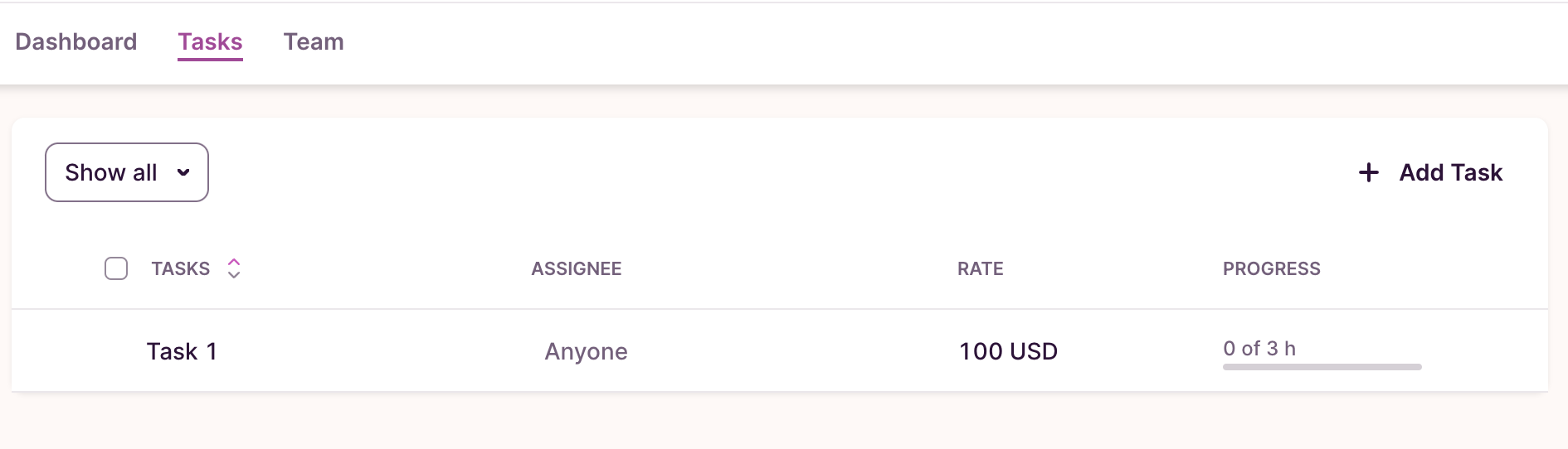 Click on "+ Add task" to create a new task and you will be able to add a Task Name, Assignee, Billable rate and Time Estimate inline.