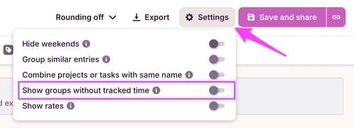 On any of the preset reports (Summary, Detailed, Workload and Profitability) click the Settings cog in the top right corner and enable the "Show Groups without Tracked Time" setting to get a report for which projects, users or groups have no time tracked for your chosen date range.