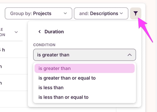 Duration is less than: Choose this to find time entries shorter than a specific duration, for example 0:01:00 for under 1 minute.