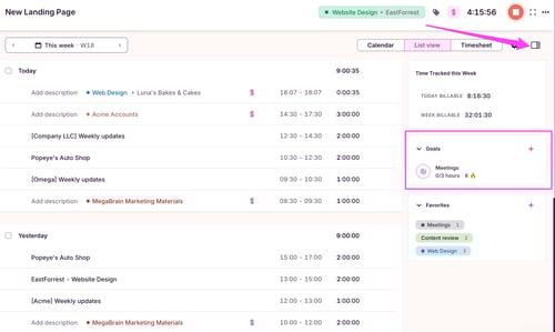 You can create a Goal from all Timer page views: List-view, Weekly Calendar and, Timesheet-view on the Webapp, or from the List-view on our Windows App or iOS App.