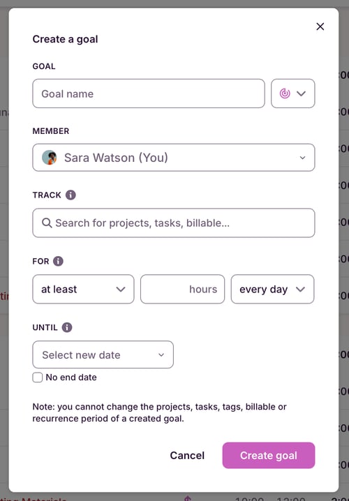 To track progress towards your Goal, you link them to specific projects, tasks, and/or tags. You can also choose if you want to limit it to Billable time entries. Any time tracked that matches these conditions, will be added to the Goal.