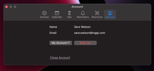 The Account tab is where you can see your name and the email address you're logged in with. Click on My account to navigate to the Toggl Account Settings page, or click Sign out to sign out of the app. You can also close your account from here.