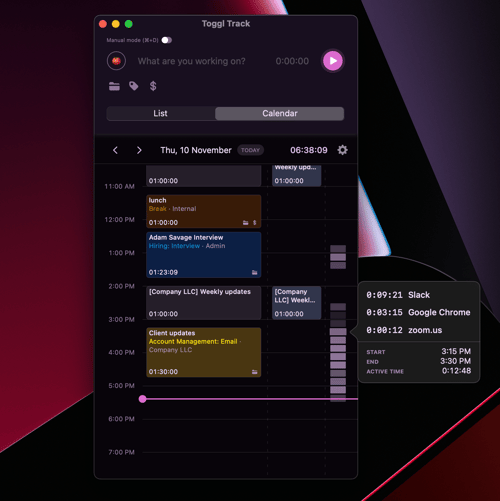 The Calendar view shows your tracked time in a vertical timeline side-by-side with your calendar events and timeline data. You can switch to the calendar view at the top of the main app window and navigate between specific dates. You can only view the last 8 weeks in Calendar view.