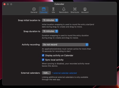 Activity recording: Enable timeline recording on your desktop app. You can choose to disable it, enable it and then choose what data is recorded. You can also choose whether you want the activity displayed on calendar-view, or whether you want to sync the local activity with our server or not. More on timeline here.
