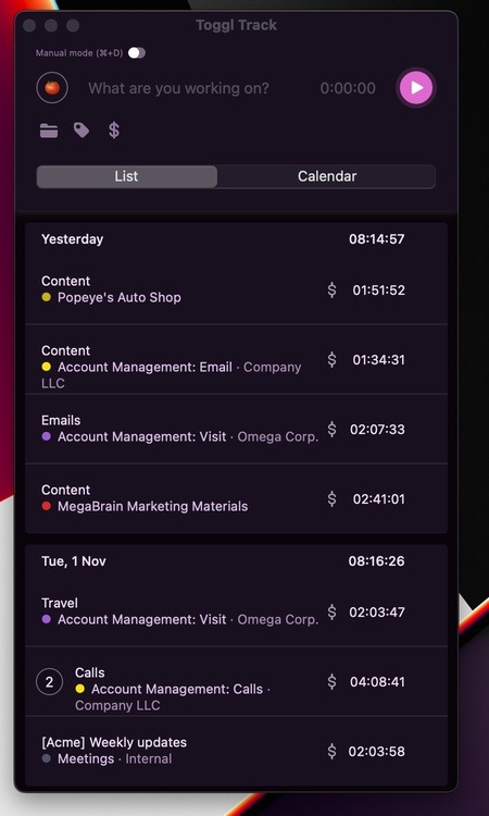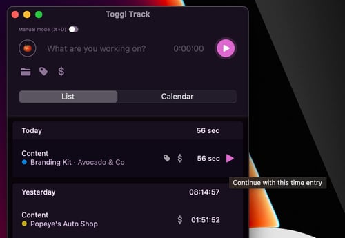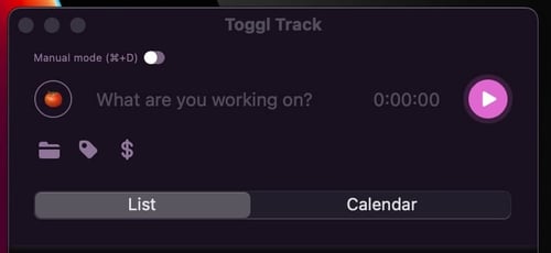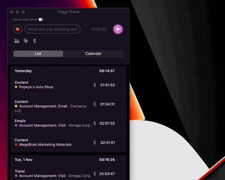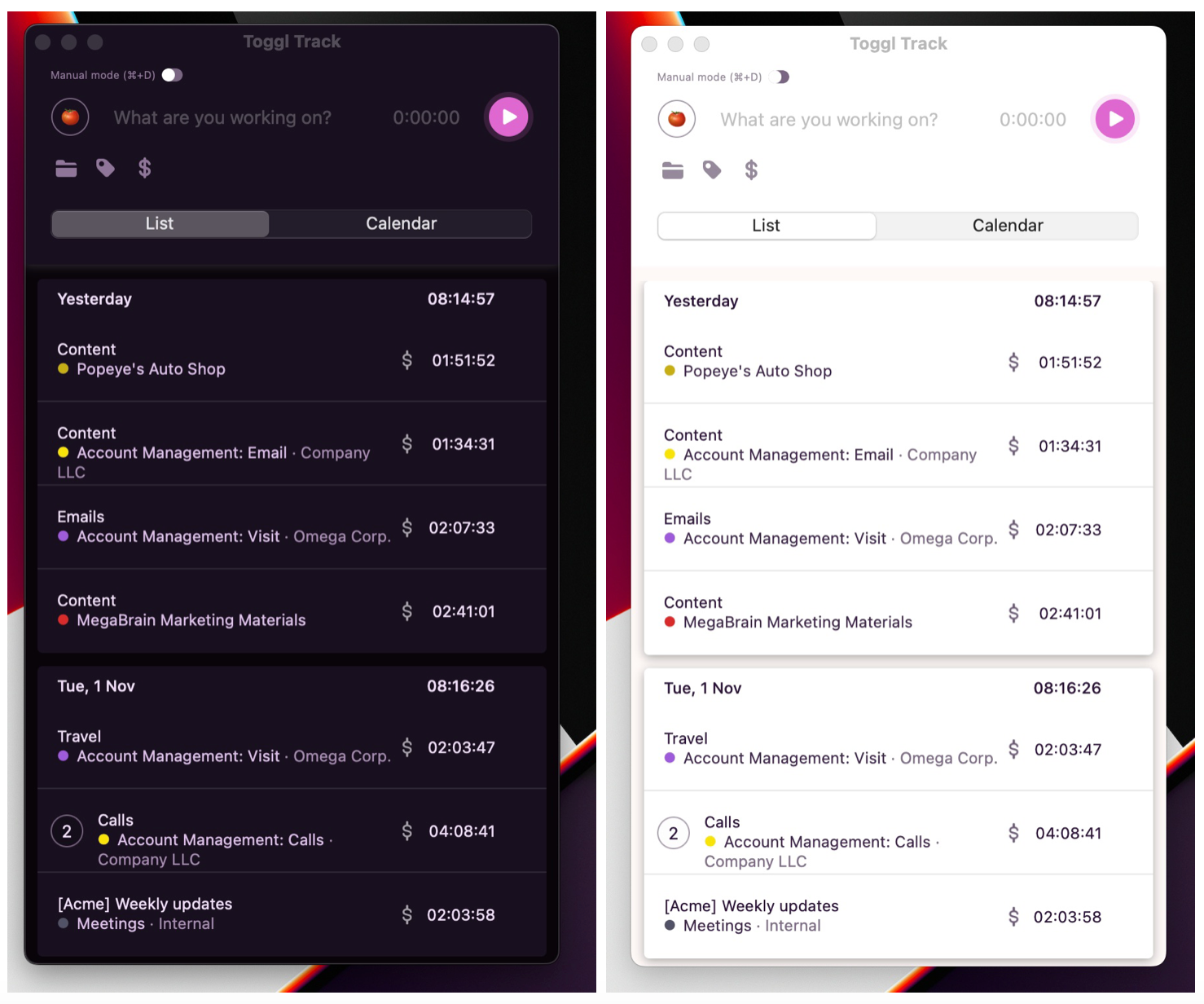 NOTE: Toggl Track will switch between Light and Dark mode based on your macOS preferences.