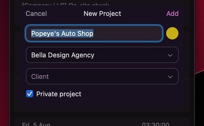 A popup will open where you can define the project name, color (customizable colors available on paid plans only), workspace, and client. You can also choose if this project is private or not. More on creating Projects here.
