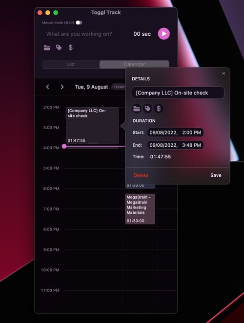 The app offers two views; List and Calendar, bringing our Calendar feature into the desktop app and allowing users to add/edit time entries directly in it. Both views allow you to track and edit time entries.