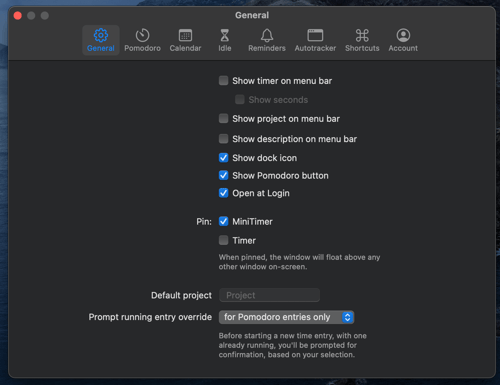 Show timer on menu bar: View the running entry on the Menu bar next to the Toggl Track icon