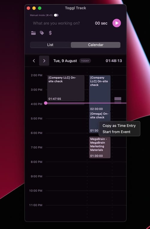 Next to them, you will see your calendar events. Hovering over an imported calendar event will reveal its details. You can right-click on a calendar event to copy it as a time entry with it's original duration or start a running timer based on that event.
