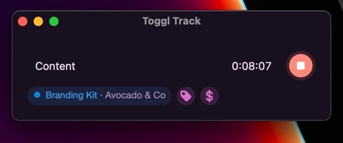 To make it easier to differentiate, the Toggl Track desktop app icon on your dock will be pink when the timer is running, and grey when it is not. The same applies to the menu bar, but in different colors: black or transparent.