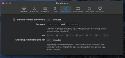 Use this tab to set reminders to track time for yourself. You can choose how often you want to reminded, the window of time you wish to be reminded during, and the days of the week the reminders should be active on.
