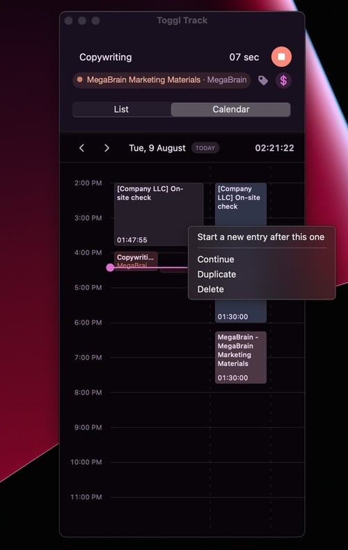 You can also right-click on existing Time Entries, and choose to either a start a new time entry after it, Continue, Duplicate or Delete it.