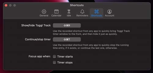 Show/Hide Toggl: Set a global shortcut to show or hide the Toggl Track app. This will work even when the app is not in focus.