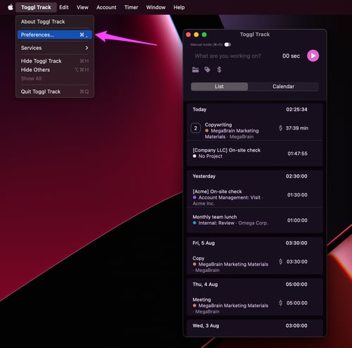 To edit the settings of your desktop app, just click Toggl Track in the menu bar and then choose Preferences or use the keyboard shortcut "CMD + ,"