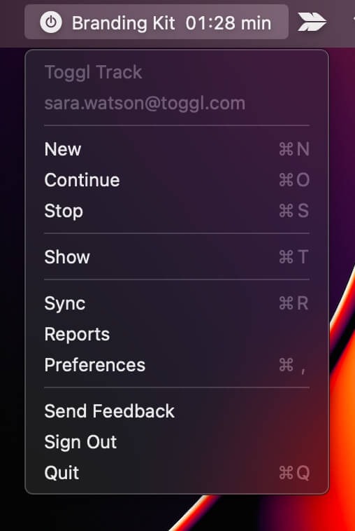 You can also click on the menu bar icon in the top right to quickly start/stop timers, sync app, go to webapp reports or send feedback.