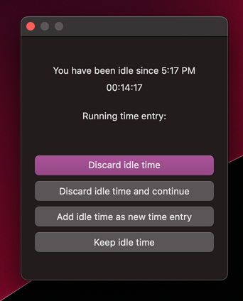 Add idle time as new time entry: Stops previously running timer, and adds idle time as a new time entry.