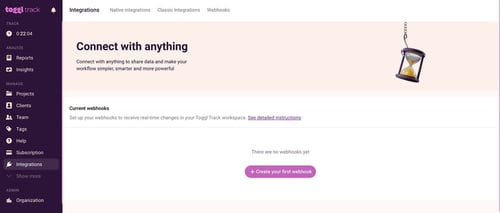 Toggl Track has webhooks for developers looking to build their own custom integrations.