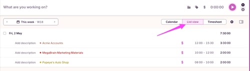 Our List-view shows your time entries (grouped or ungrouped based on your settings) so you can bulk edit them if required. You can also see useful visualization of where your time has been spent.