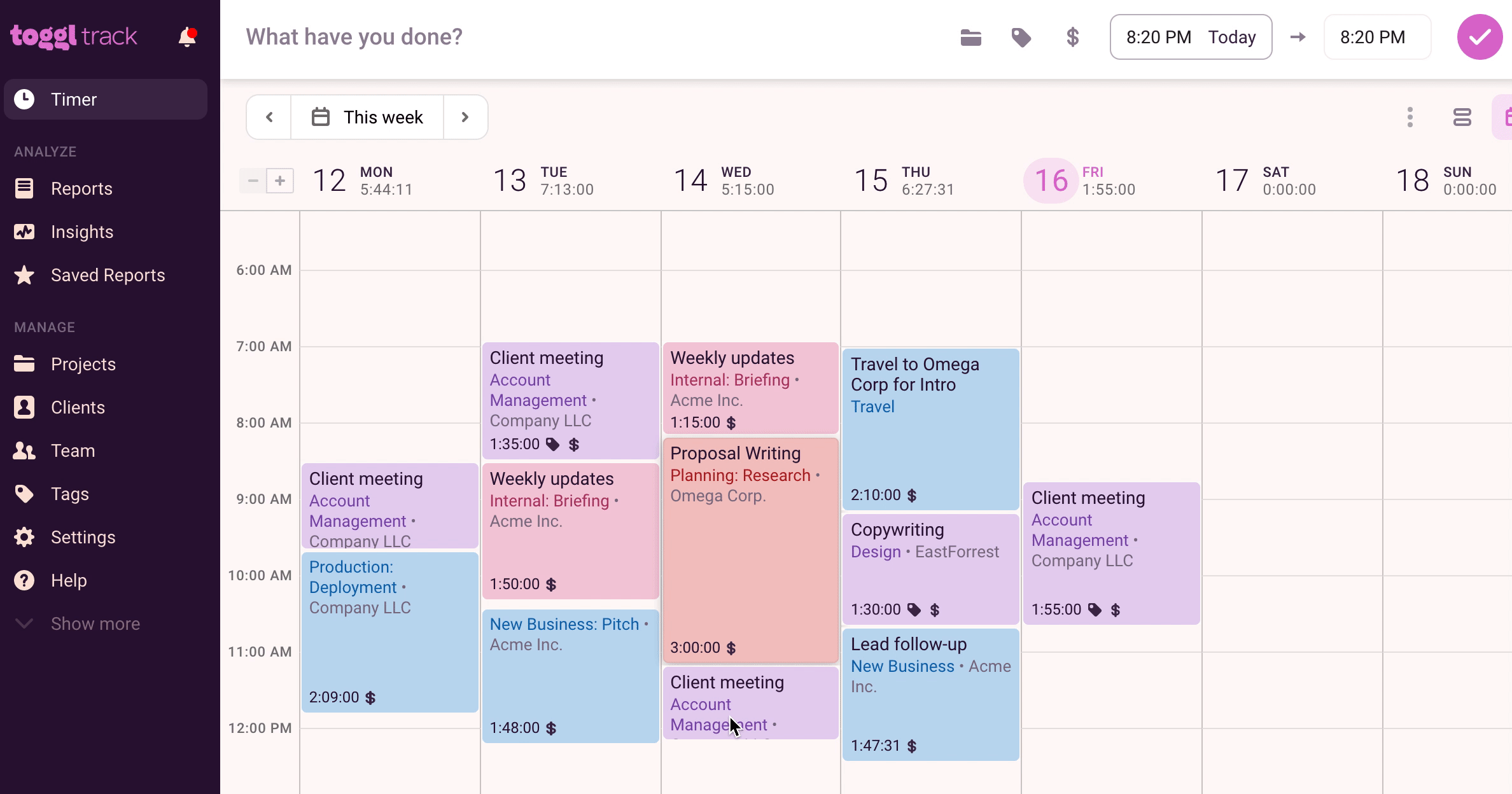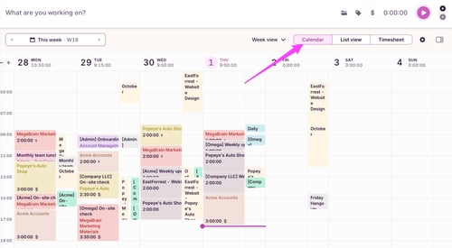Our Calendar view allows you to easily see what you did all week in one view. On this view, you can look for gaps in your day, and add or edit time entries. You can also easily see how much time you logged for each day.