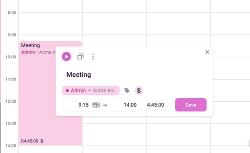 You can also click and drag on the screen to create a larger time entry, and we will pre-populate the start and end times based on this.