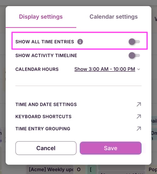 Unlike List view, the calendar views display your time entries across all organizations if Show All Entries is enabled in the Display Settings accessible via the Settings Cog in the top-right corner.