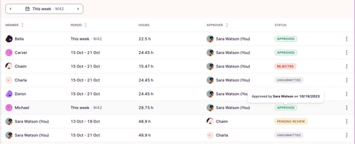 Timesheets can be under one of four statuses at any given time. You can hover over a timesheet's status to see when it was submitted, approved, or rejected and by whom.