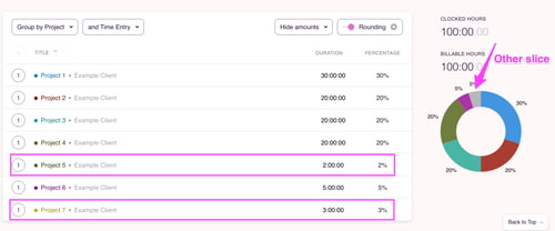 In the Pie Chart, you will see: percentages for Projects 1, 2, 3, 4, and 6 individually, but then Project 5 and 7 will be grouped together as they makeup super small percentages of the chart, and adding them all individually would result in lots of small "pie" pieces you couldn't differentiate.