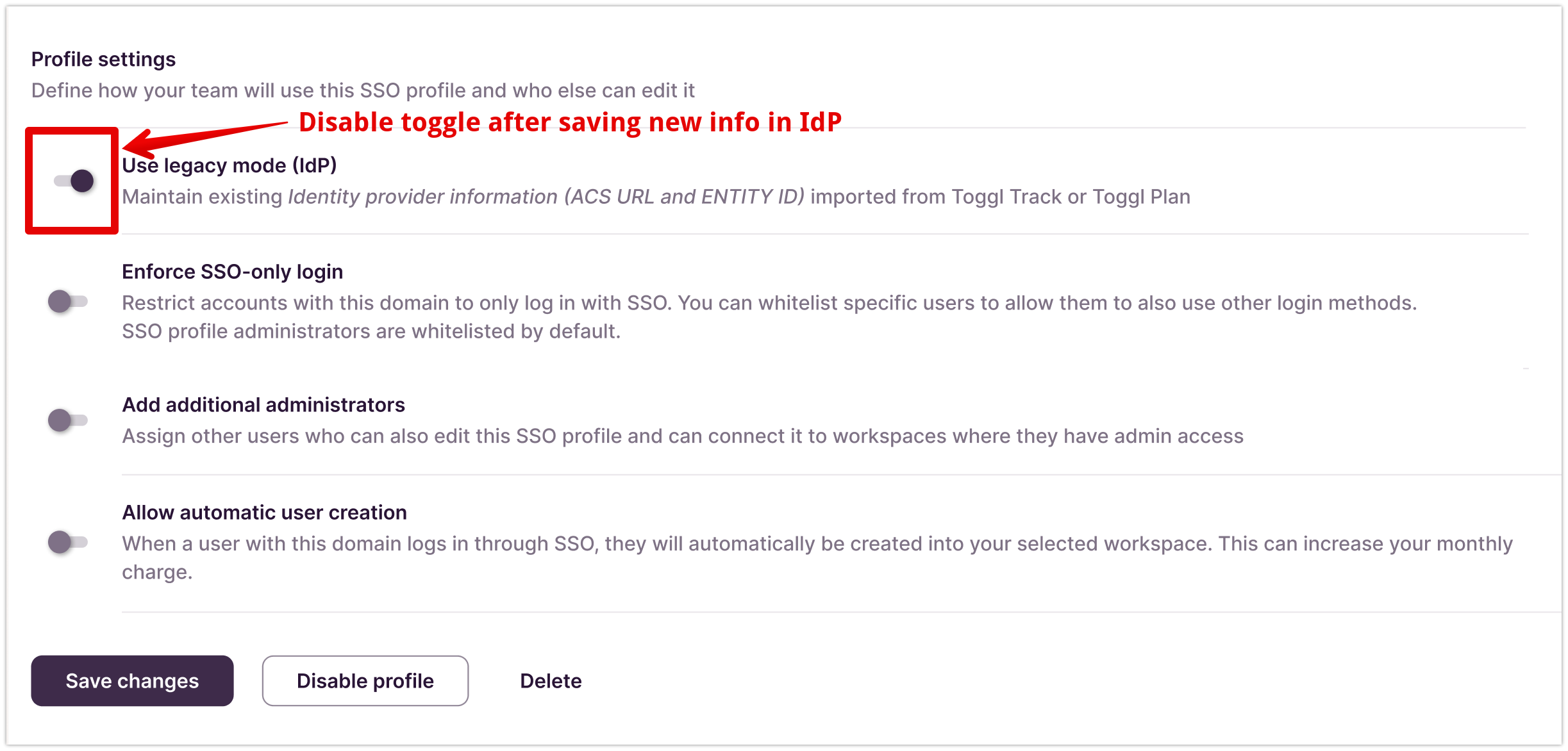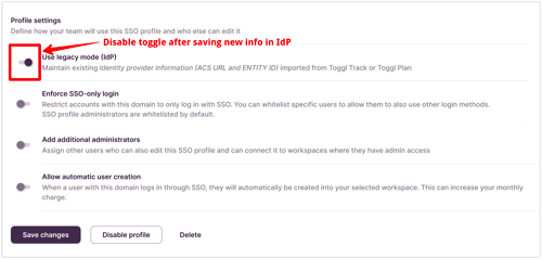 Back in Toggl SSO, disable the ‘Use legacy mode (IdP)’ toggle on the Profile settings section.