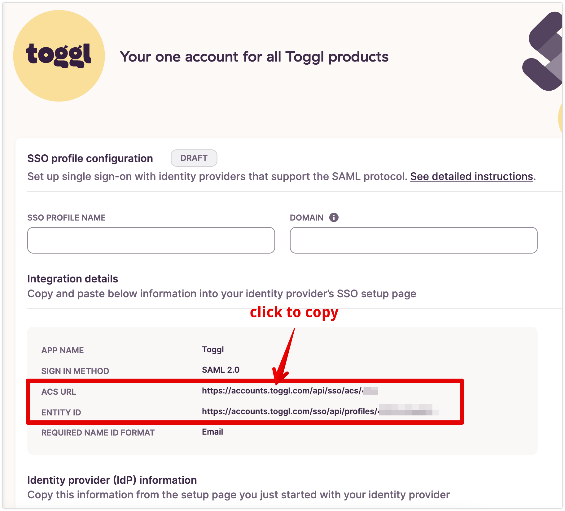 However, the new integration has a different ACS URL and Entity ID from Toggl. We recommend that you update these details within your identity provider, so that you can be fully switched over. Here's how: