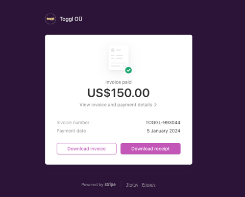 If you just want to view invoice and payment details, or download payment receipt, click anywhere on the invoice line and a new page will open with this information.