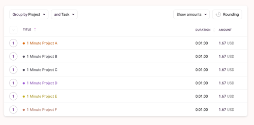 Here's an example: We have six Projects. Each Project has an hourly rate of €100, and a total tracked time of 1 minute each.