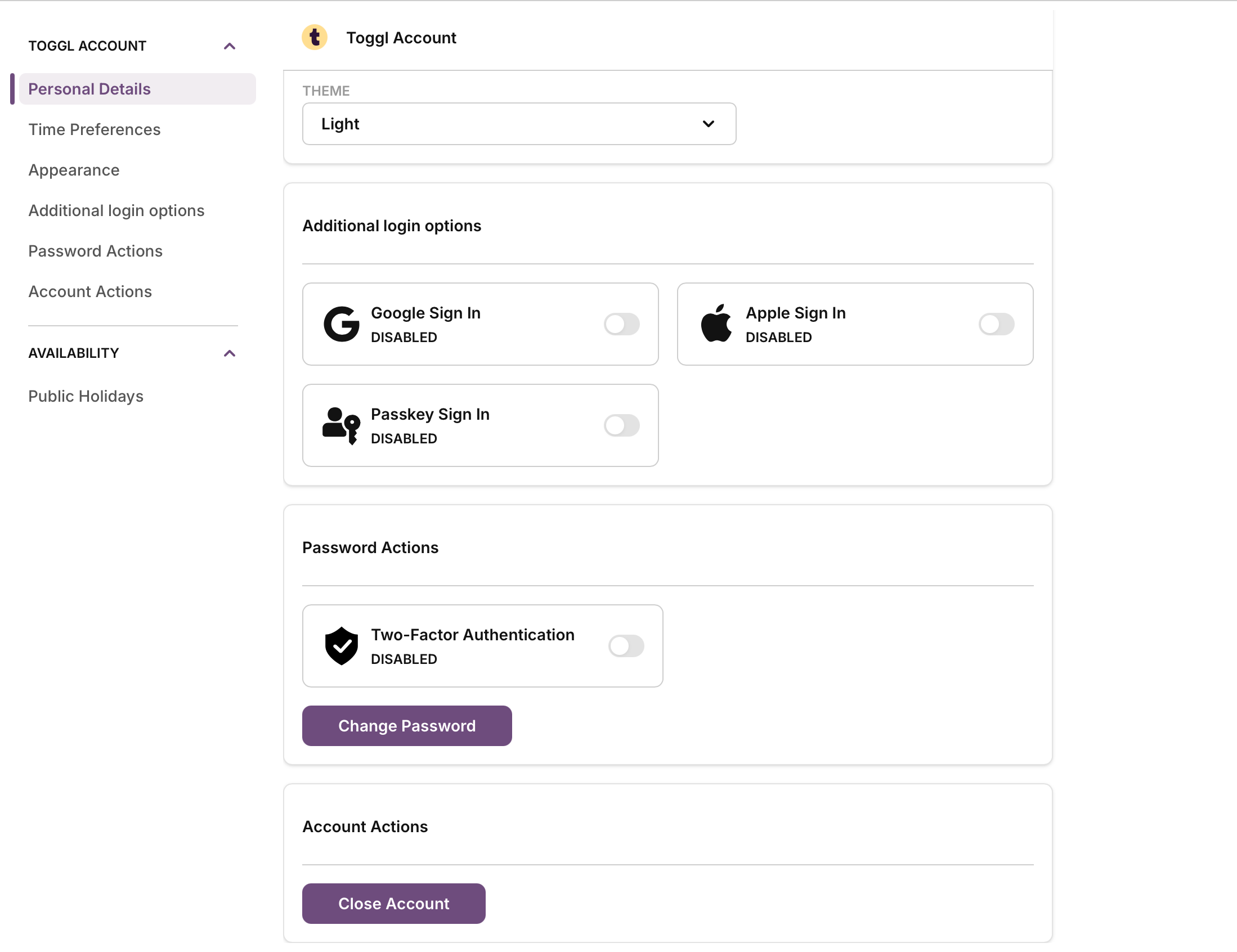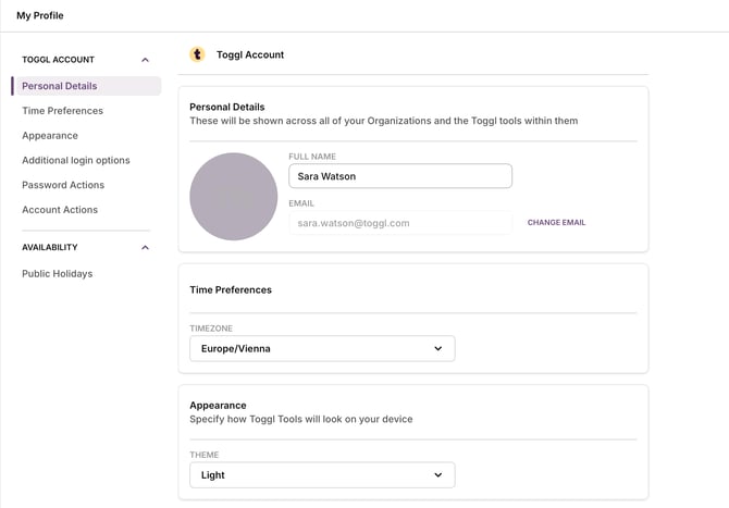 Personal settings like your name, email address, password, timezone and alternate login options are managed at the Toggl account level.